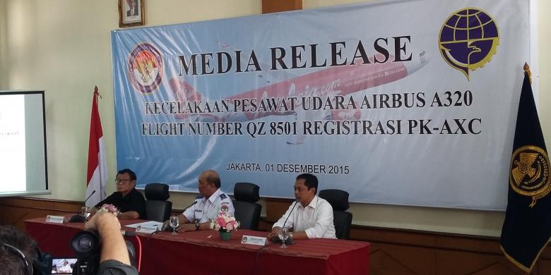 Komite Nasional Keselamatan Transportasi (KNKT) memberikan keterangan terkait kecelakaan pesawat AirAsia QZ8501, di Gedung KNKT, Jakarta Pusat, Selasa (1/12/2015).