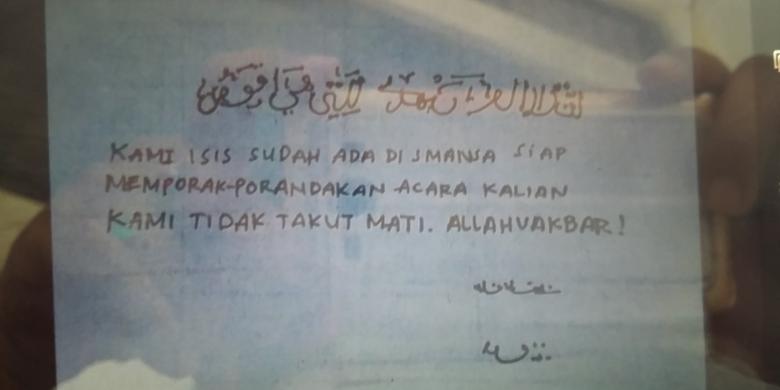 "KAMI ISIS SUDAH ADA DI SMANSA SIAP MEMPORAKPORANDAKAN ACARA KALIAN. KAMI TIDAK TAKUT MATI. ALLAHUAKBAR!"