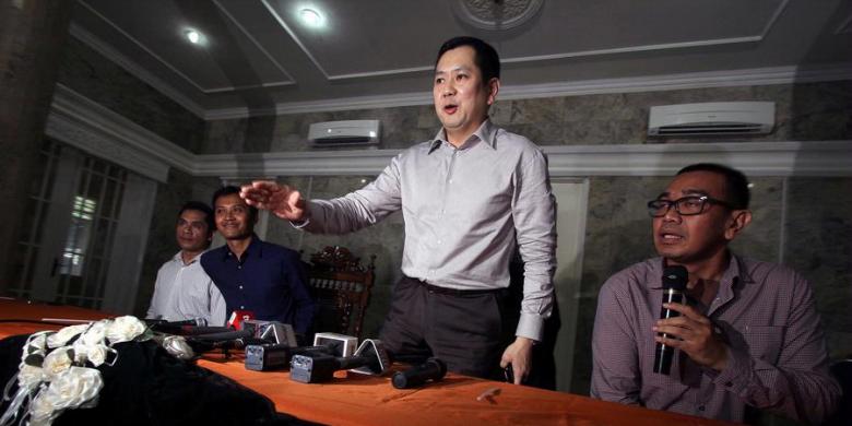 Mantan ketua Dewan Pakar Partai Nasdem Hary Tanoesoedibyo mengikuti konferensi pers pengunduran dirinya dari Partai Nasdem, di Jakarta, Senin (21/1/2013). Hari ini pengusaha Hary Tanoesoedibyo mengundurkan diri dari kepengurusan dan keanggotaan Partai Nasdem karena menganggap sudah tidak ada kecocokan visi dengan Ketua Dewan Pembina Surya Paloh. Pengunduran Hary juga diikuti oleh beberapa pengurus teras Partai Nasdem, termasuk Sekjen Partai Ahmad Rofiq.