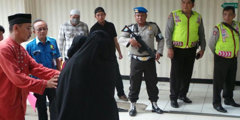 SM yang mengenakan burqa serba hitam keluar seusai melihat jenazah suami. SM tampak berdiri sendiri menunggu jenazah keluar. Petugas rumah sakit dan polisi ikut berjaga.