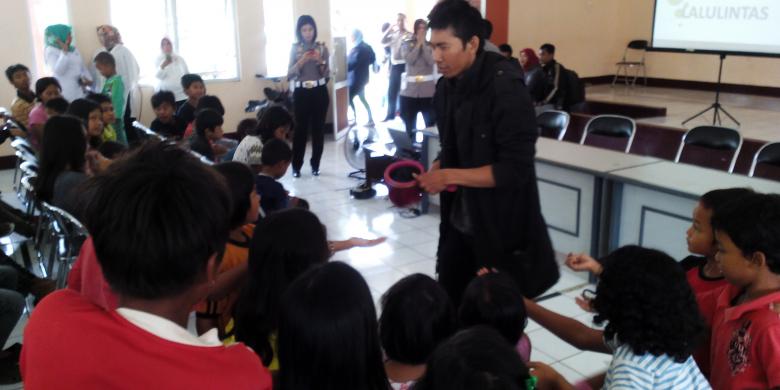 Seorang pesulap saat mempertunjukan keahliannya kepada para anak eks Gafatar di penampungan Dinas Sosial Provinsi Jawa Barat, Jalan Amir Mahmud, Kota Cimahi, Kamis (28/1/2016)