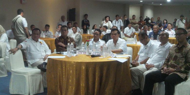 Para bakal calon gubernur Partai Gerindra saat hadir dalam acara penjaringan yang diadakan di Hotel Sari Pan Pacific, Jakarta Pusat, Rabu (27/1/2016). Mereka adalah Ketua DPD Gerindra DKI Mohamad Taufik, Wakil Ketua Dewan Pembina Sandiaga Uno, anggota Fraksi Gerindra di DPR RI Biem Benjamin, dan anggota DPRD DKI Mohamad Sanusi. Selain itu, hadir pula para politisi di internal Partai Gerindra, diantaranya dua anggota DPR RI Aryo Djojohadikusumo dan Riza Patria.