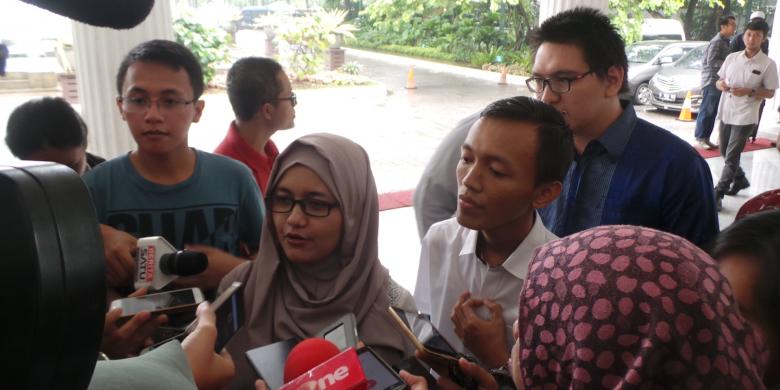Juru Bicara Teman Ahok, Amalia Ayuningtyas (berjilbab) menjawab pertanyaan wartawan. Komunitas Teman Ahok memenuhi undangan makan siang Gubernur DKI Jakarta Basuki Tjahaja Purnama di Balai Kota, Senin (25/1/2016).