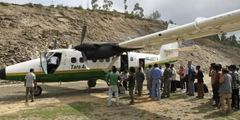 Dalam foto yang diambol pada 1 Juni 2010 ini sebuat pesawat ringan jenis Twin Otter milik Tara Air berada di bandara Lamidanda di sebelah timur Kathmandu, Nepal.