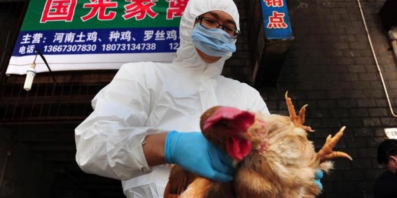Dalam foto ini terlihat seorang petugas dari Pusat Pengendalian dan Pencegahan Penyakit Hewan di Changsa, Provinsi Hunan, China, tengah memeriksa seekor ayam dalam rangka mencegah penyebaran flu burung.