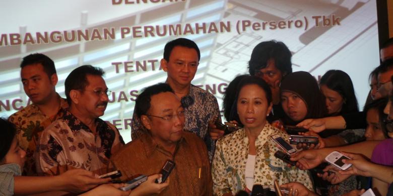 Gubernur DKI Jakarta Basuki Tjahaja Purnama, Direktur Utama PT Jakarta Propertindo (Jakpro) Abdul Hadi, Direktur Utama PT Pembangunan Perumahan (Persero) Bambang Triwibowo, Menteri BUMN Rini Soemarno saat penandatanganan nota kesepahaman kerjasama PT Jakpro dan PT PP (Persero), di Balai Kota, Jumat (4/12/2015).
