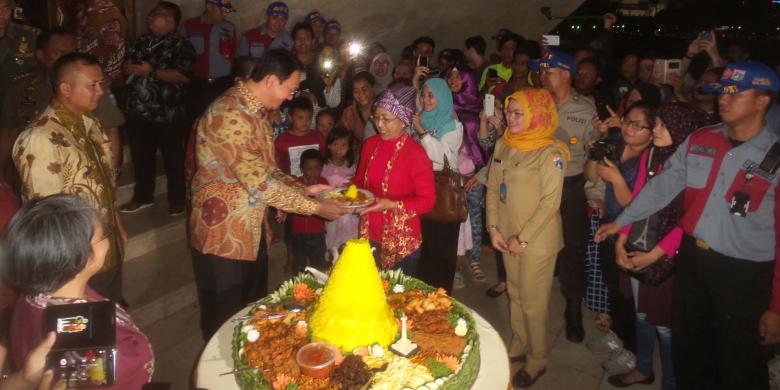 Gubernur DKI Jakarta Basuki Tjahaja Purnama memberikan potongan tumpeng kepada salah seorang pengunjung Monumen Nasional yang menandai wisata malam di tempat tersebut, Selasa (5/4/2016) sekitar pukul 19.30.