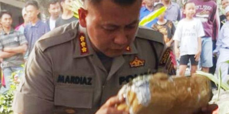Kapolresta Medan sedang memeriksa 1 kilogram daun ganja kering yang berhasil disita dari kawasan perkampungan rawan narkoba Medan