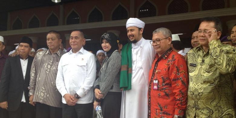 Menteri Pertahanan Ryamizard Ryacudu berfoto bersama pengasuh Pondok Pesantren Al Asriyyah Nurul Iman, Kabupaten Bogor Umi Waheeda Binti H Abdul Rahman (perempuan) dan Habib Muhammad Walilulah (bersorban) seusai memberikan ceramah bela negara kepada ribuan santri pondok tersebut, Jumat (8/4). Pondok pesantren ini mengajarkan santri-santrinya untuk mandiri dan mau berusaha, tak mengandalkan proposal untuk mendapatkan dana kegiatan atau meminta uang di jalanan untuk membangun masjid seperti kerap terjadi.