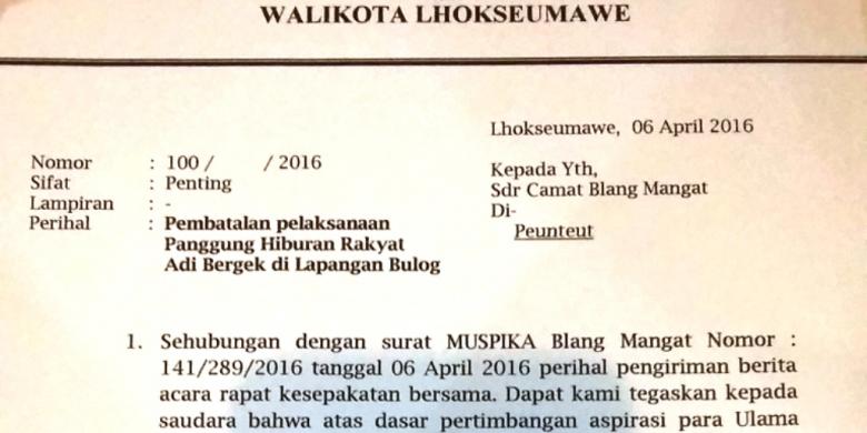Salinan surat larangan konser itu ditandatangani Suaidi Yahya tertanggal 6 April 2016. Surat itu ditujukan kepada Camat Blang Mangat dengan bunyi pembatalan panggung hiburan rakyat Adi Bergek di Lapangan Bulog Punteut Lhokseumawe.