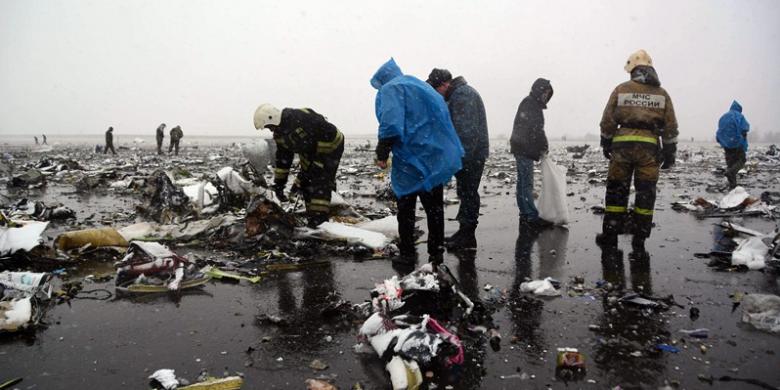 Tim dari Kementerian Transportasi Rusia sedang melakukan penyisiran di lokasi jatuhnya pesawat Flydubai yang menewaskan 62 orang di kota Rostov-on-Don.