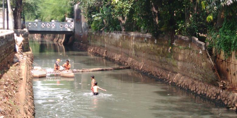 wajahnya yang basah. Itulah pemandangan yang Kompas.com saksikan Jumat (6/5/2016) siang di Kali Mampang, tepatnya di Komplek Kemang Timur, Jakarta Selatan.
