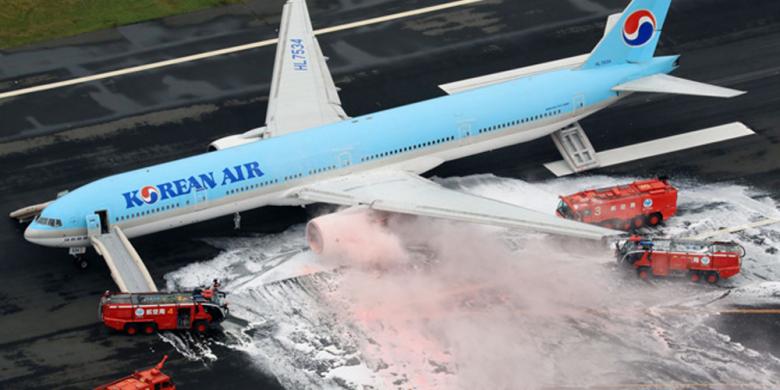 Foto proses pemadaman terhadap pesawat jet Korean Air di Bandara Haneda, Tokyo, Jepang, Jumat 27 Mei 2016.