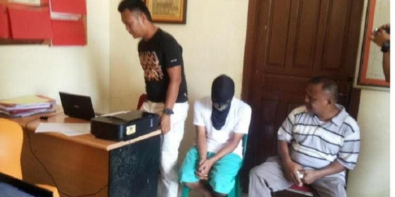 Untung mendampingi anaknya JE (17) di Polsek Taman Sari Jum at (27/5/2016).