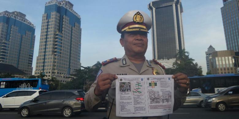 Pada pekan pertama pemberlakuan ganjil genap, anggota Polri, Dishub, dan Satpol PP hanya membagikan brosur informasi ganjil genap kepada pengendara, Rabu (27/7/2016).