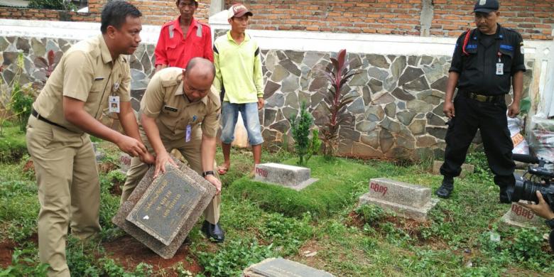 Kepala Dinas Pertamanan dan Pemakaman DKI Jakarta Djafar Muchlisin dan Kepala Suku Dinas Pemakaman Jakarta Pusat Munjirin membongkar makam fiktif di TPU Kawi-kawi, Johar Baru, Jakarta Pusat, Senin (25/7/2016).