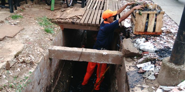 Seorang petugas prasarana dan sarana umum (PPSU) nampak sedang bekerja membersihkan sampah di saluran air depan Pasar Warung Buncit, kawasan Kelurahan Bangka, Kecamatan Pancoran, Jakarta Selatan. Senin (16/5/2016).
