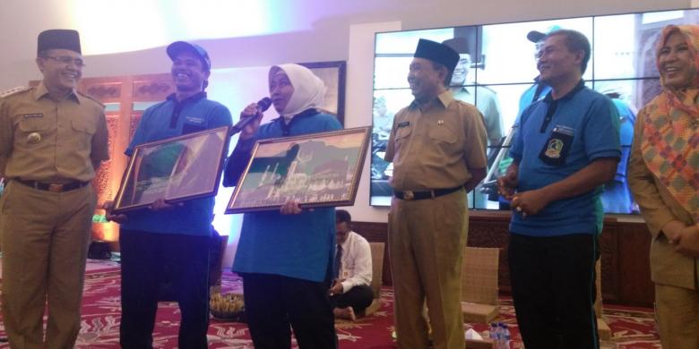 BANYUWANGI, Dua orang pesapon (penyapu jalanan) Dinas Kebersihan dan Pertamanan (DKP) mendapatkan umrah gratis saat tasyakuran atas Adipura Buana yang diperolah Kabupaten Banyuwangi, Selasa (26/7/2016).