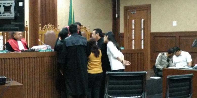 Terdakwa Jessica Kumala Wongso, kuasa hukum Jessica, dan jaksa melihat warna sisa es kopi vietnam yang ditunjukan majelis hakim di persidangan di Pengadilan Negeri Jakarta Pusat, Kamis (28/7/2016)