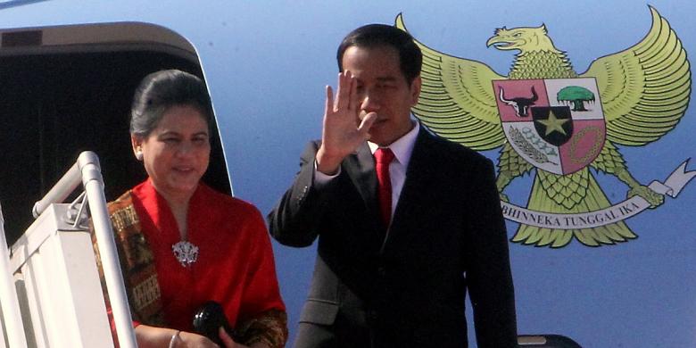 Presiden Joko Widodo didampingi Ny Iriana Joko Widodo memasuki pesawat kepresidenan untuk bertolak ke Amerika Serikat dari Bandara Halim Perdana Kusuma, Jakarta, Minggu (14/2/2016).