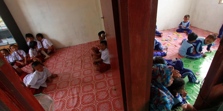 Pada salah deret bangunan barak tampak sebuah ruangan berukuran 6 x 6 meter persegi yang dipadati puluhan anak berseragam merah putih dan seragam ungu.