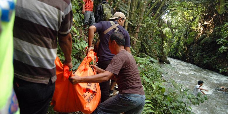 Petugas kepolisian mengevakusi potongan tubuh manusia yang ditemukan di aliran Kali Baru, Kampung Ciater, Desa Sukaraja, Kecamatan Sukaraja, Kabupaten Bogor, Kamis (14/7/2016)
