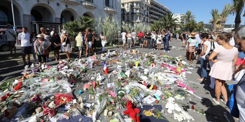Warga meletakkan karangan bunga di Promenade des Anglais, Nice untuk mengenang korban tragedi truk maut yang menewaskan 84 orang.
