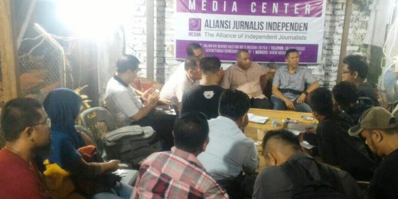 Satgas Dewan Pers saat memaparkan hasil investigasinya terkait kekerasan pers oleh TNI di Sekretariat AJI Medan, Selasa (23/8/2016).