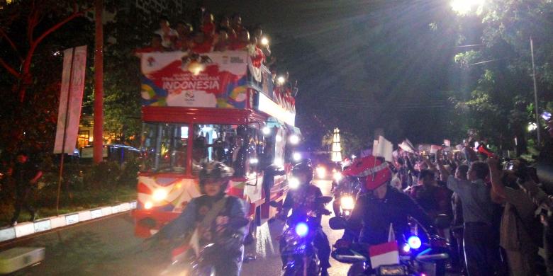 Bus Bandros yang ditumpangi oleh kontingen atlet Indonesia yang berlaga di Olimpiade Rio De Jainero saat melintas di kawasan Senayan, Jakarta Pusat pada Selasa (23/8/2016).