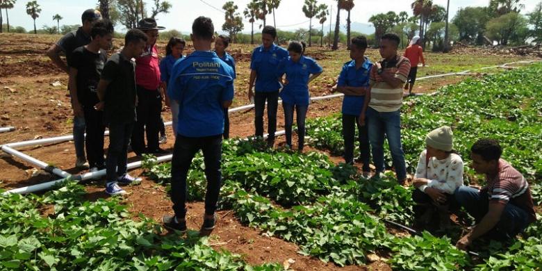 Mahasiswa Politeknik Pertanian Negeri Kupang, NTT sedang belajar tentang pengembangan ubi ungu di kebun milik anggota DPD RI Ibrahim Agustinus Medah