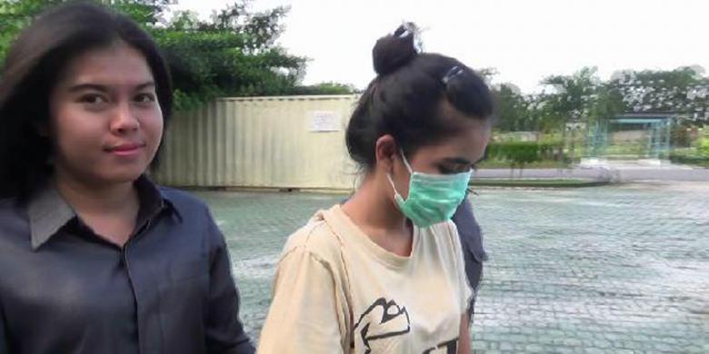 Seorang wanita (pakai masker) tersangka kasus penipuan online via akun BalckBerry Messenger diamankan di Polda Bangka Belitung