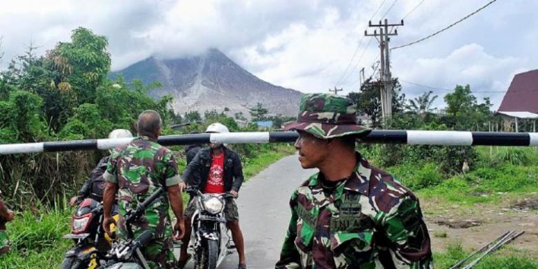 Petugas memperingatkan dua warga yang hendak keluar dari zona merah erupsi Sinabung di portal simpang Sibintun, Kecamatan Simpang Empat, Kabupaten Karo, Rabu (2/11/2016). Meskipun status Gunung Sinabung Awas dan potensi erupsi dan luncuran awan panas tinggi, peringatan untuk tidak beraktivitas di zona merah Sinabung masih terus dilanggar warga.